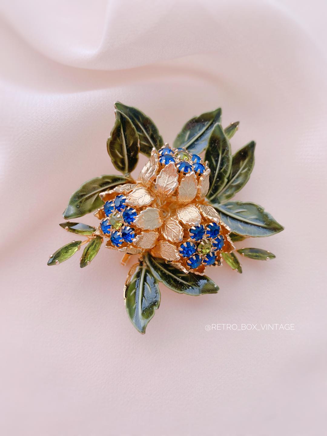 Украшение выполнено в 50-60-е годы прошлого столетия.Объёмная брошь текстурированного металла с золотым покрытием выполнена в виде букета из трех хризантем. Каждый цветок украшен кристаллами цвета василька огранки «chaton».Великолепно сохранились эмалевые листья, покрытые вручную зелёными эмалями. Букет дополняют три соцветия из кристаллов огранки «navette».