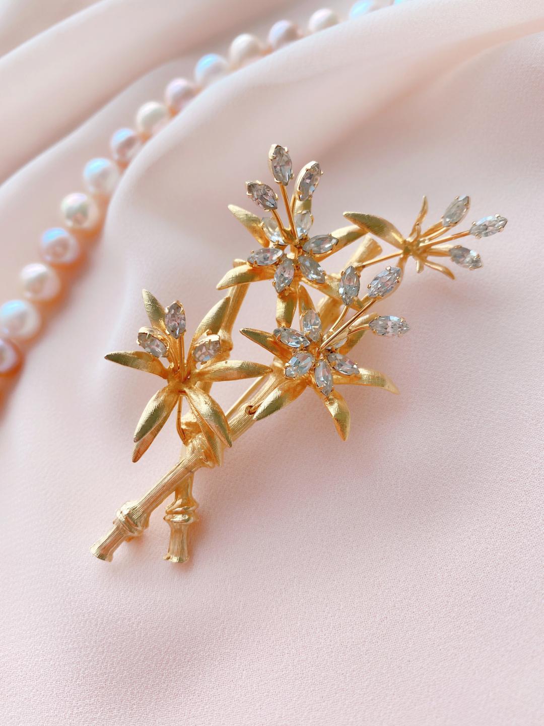 Говорят, что все стебли бамбука происходят от одного материнского ростка. И поэтому, когда бамбук цветет в Северной Америке, такой же стебель в то же самое время покрывается удивительными соцветиями в Азии или Дании. Но увидеть это чудо природы удается не каждому. Так как цветет бамбук лишь раз в 60-130 лет.Нам с вами чрезвычайно повезло, милые леди, ведь мы можем любоваться загадочными цветами китайского «господина» в великолепном исполнении ювелиров VENDOME. Изящная, элегантная и очень нежная винтажная брошь выглядит превосходно.
