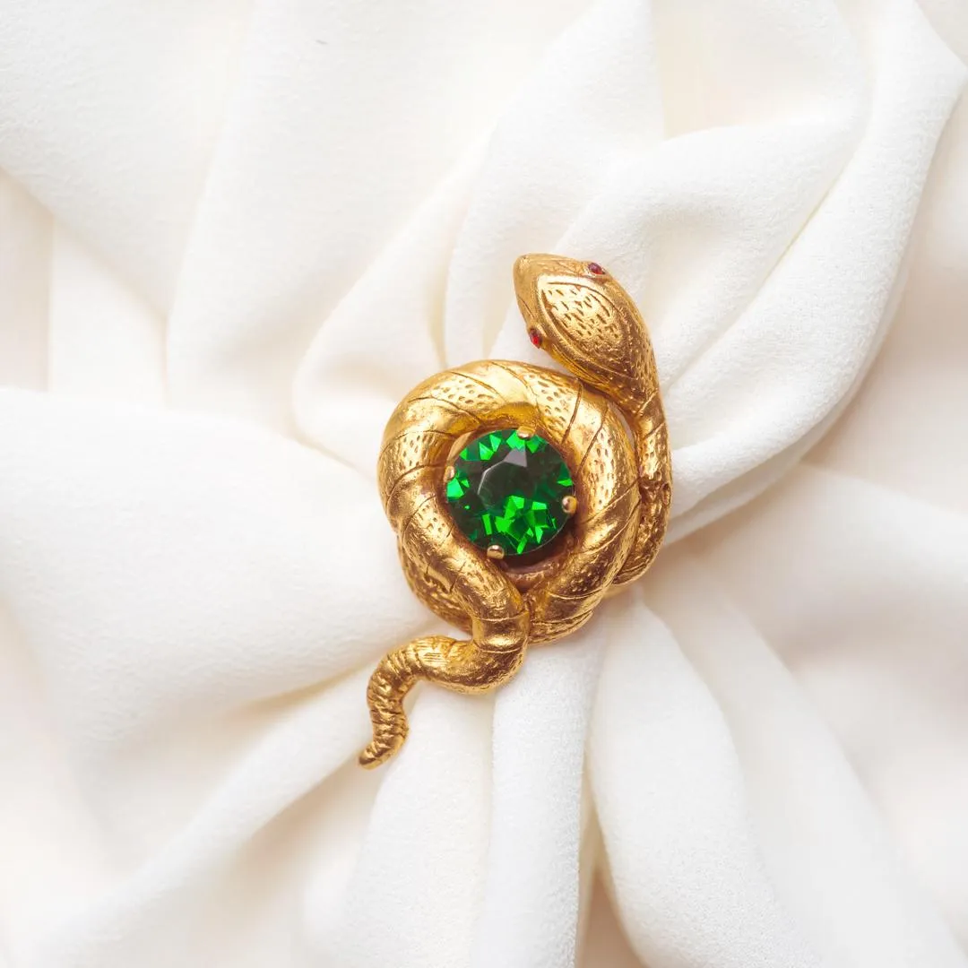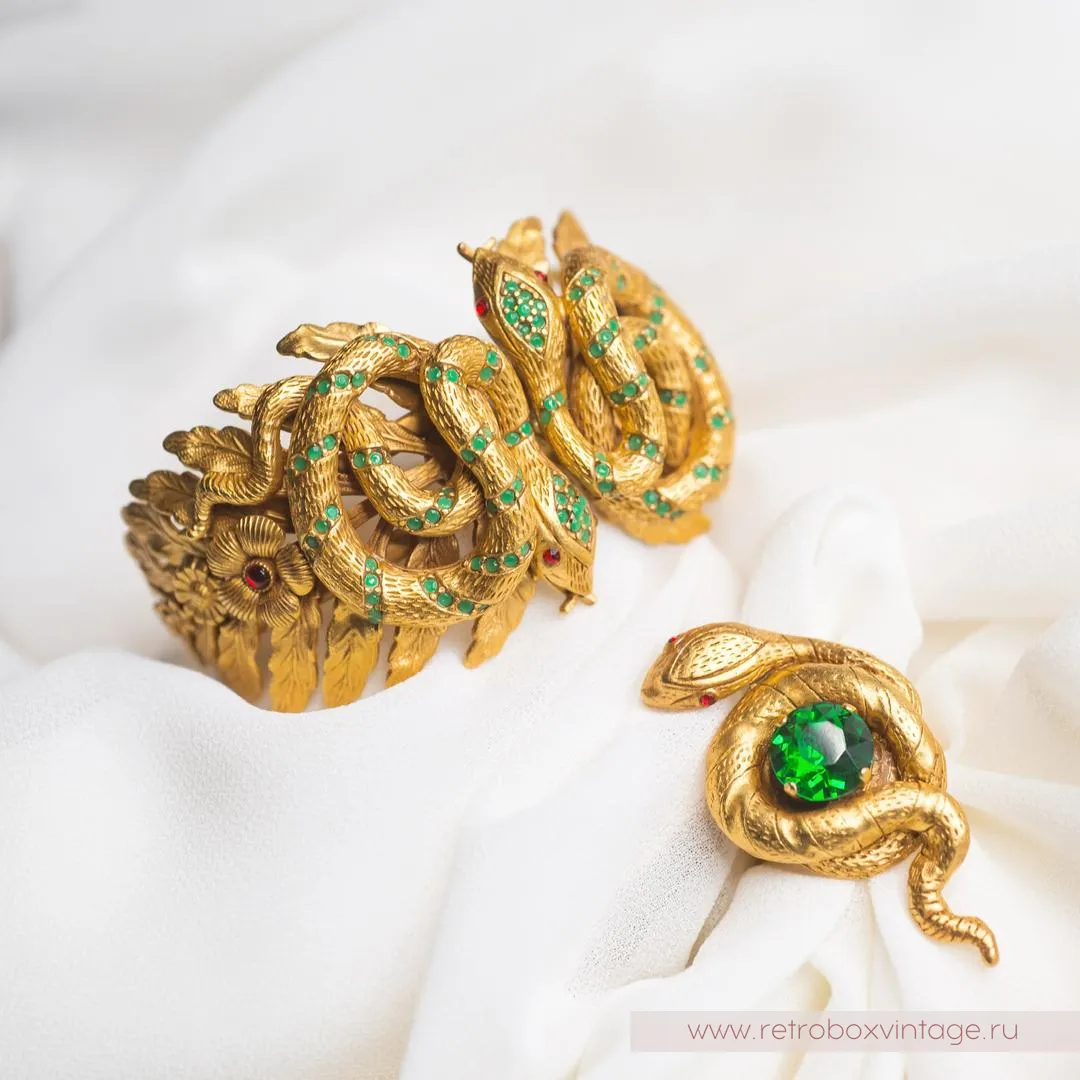 Созданные в уникальной лондонской мастерской, золотисто-изумрудные змейки – само олицетворение благородства, мудрости и шарма. Их миролюбивый облик располагает к сближению. Искусно выгнутые резные спинки с золотым покрытием, усыпанные мелкими изумрудными кабошонами, смотрятся невероятно роскошно. Рубиновые глазки-кристаллики обещают быть на страже и следить за каждым взглядом в сторону хозяйки. Вот увидите, как этим выразительным созданиям понравится блистать на ваших ручках.