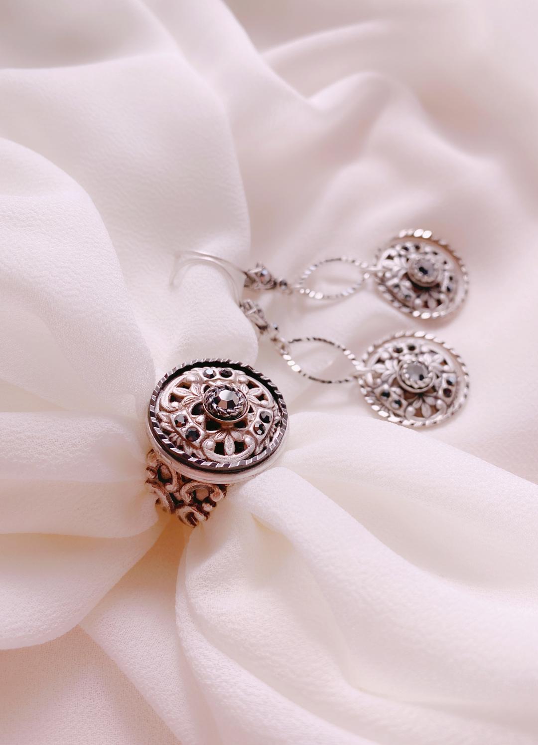 Резной серебряный диск органично смотрится в декоре серег и кольца. Изящный флористический рисунок венчают небольшие гематитовые кристаллы.