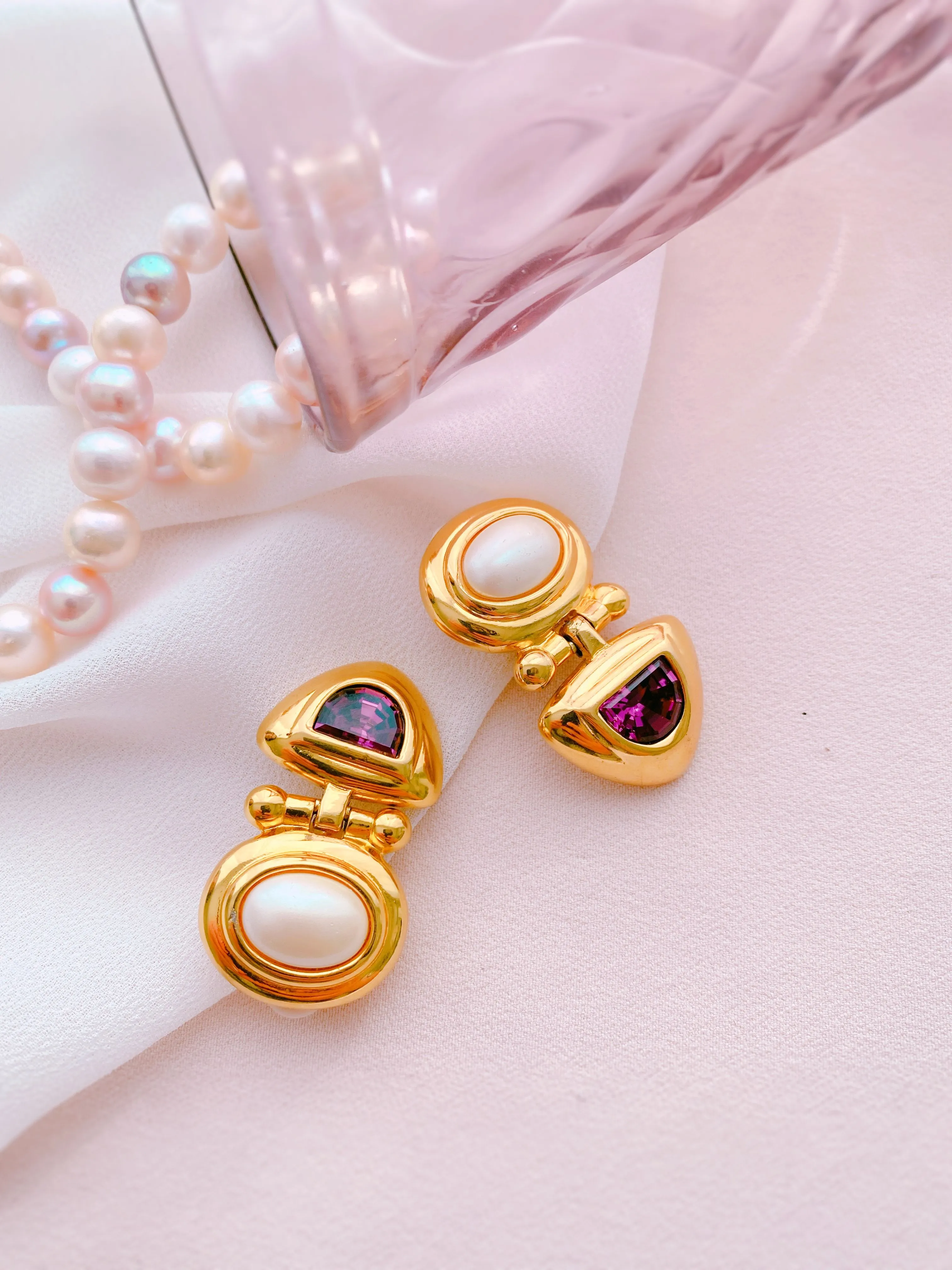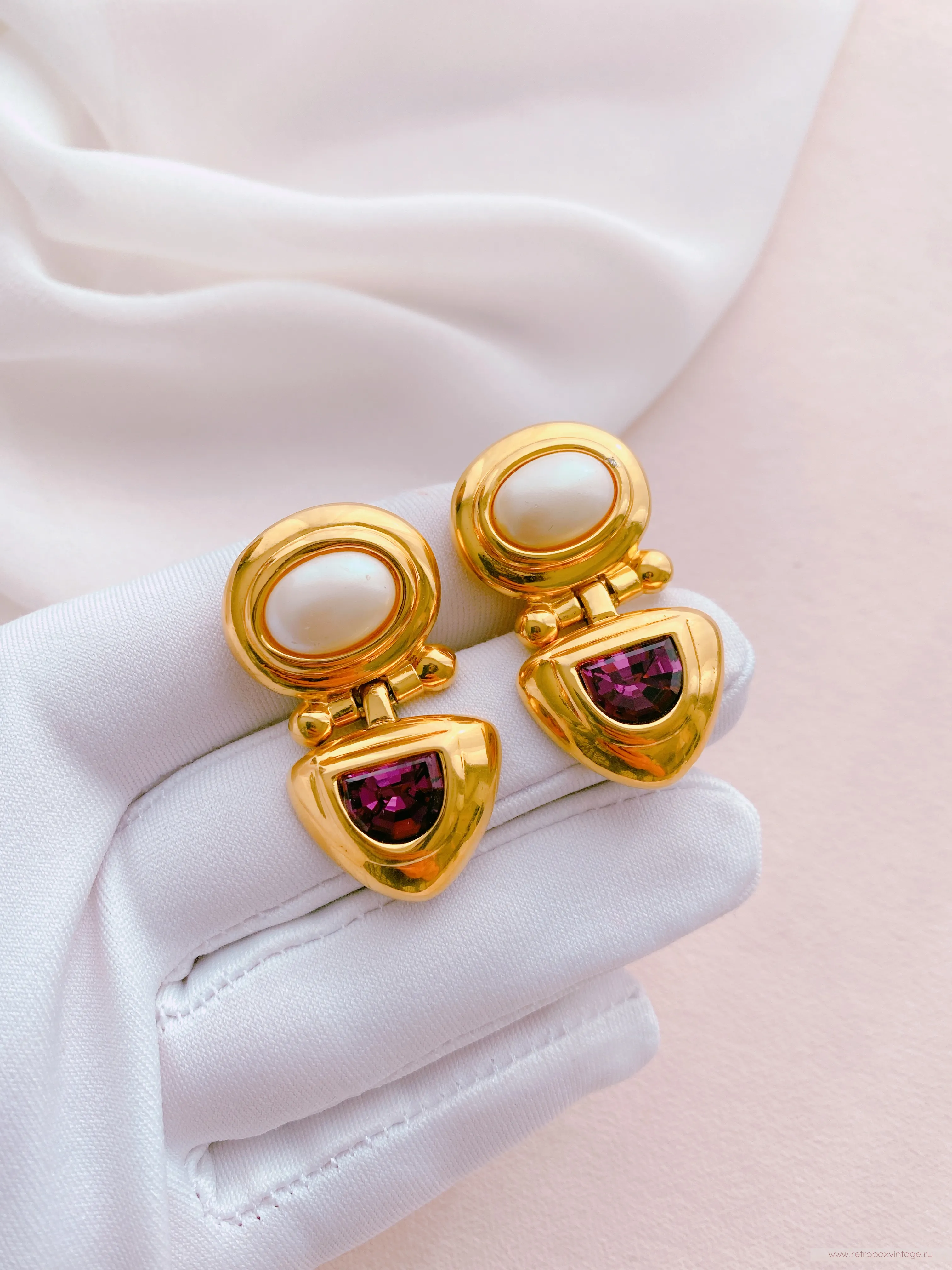 А вы знали, милые леди, что с этим необыкновенным оттенком связана одна легенда, согласно которой Мелькарт — бог и покровитель мореплавания прогуливался по берегу моря и его пёс нашёл большую раковину, открыл её и весь окрасился в необычный невиданный доселе цвет. Восхитившись этим таинственным цветом возлюбленная Мелькарта попросила добыть ей такой краски для платья, для чего бог собрал все до единой ракушки с морского дна и подарил любимой. С тех самых пор и люди начали доставать из морских глубин раковины, аккуратно раскладывать их на берегу и искать тот самый чарующий оттенок. Джоан Риверс, основательница марки, наверняка выбрала его неслучайно, ведь украшения в пурпурном цвете означают любовь, власть, царственность, знатность – всё в стиле самой несравненной актрисы.И в правду, винтажные клипсы JOAN RIVERS настолько совершенны в своём необычном и роскошном дизайне, что о них можно говорить бесконечно. При одном только взгляде, хочется взять и рассмотреть их поближе - очарование таинственного мерцания фиолетовых кристаллов и перламутрового перелива жемчуга не оставит равнодушными ни одного ценителя этого произведения бижутерного искусства.