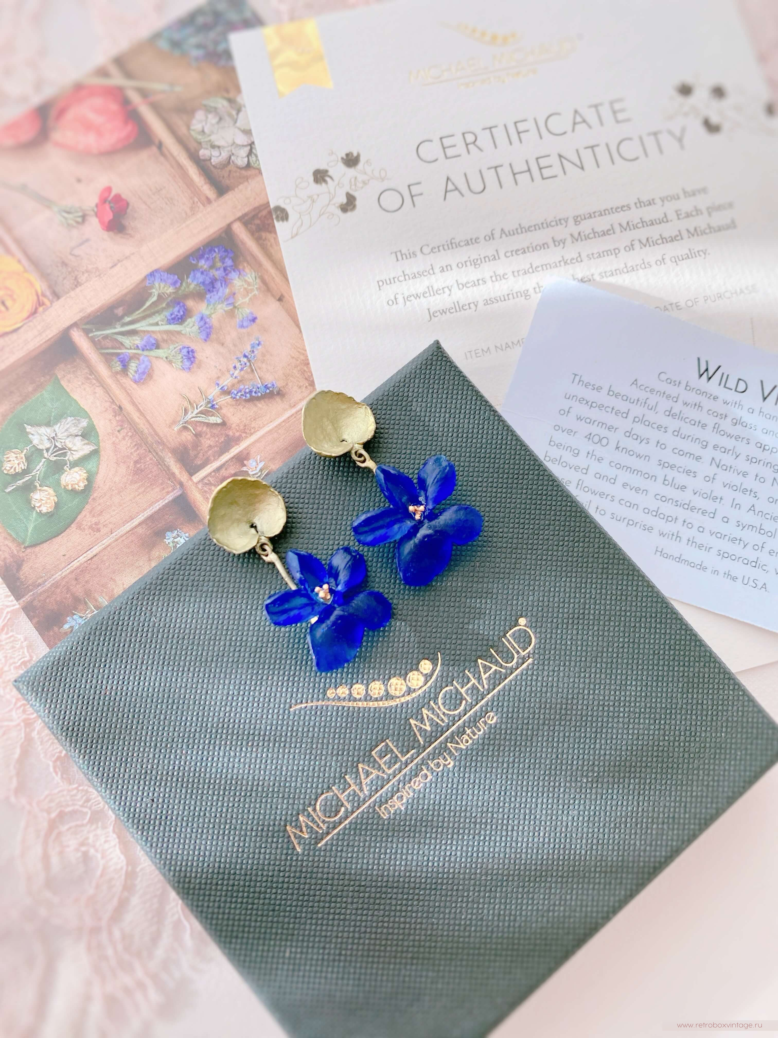 Всё это волшебство, все эти столетия нежности Майкл Мишо вдохнул в свои творения. Он — современный американский дизайнер, которого называют создателем «растительной бижутерии». В его руках бронза, серебро и стекло превращаются в живые цветы. Он использует почти забытый метод «бросания в воск» — каждое украшение обрабатывается вручную, с той же любовью, с какой садовник ухаживает за розарием. Уникальная технология обработки бронзы стала визитной карточкой марки, а элитная бижутерия Michael Michaud — это уже не просто украшения, а редкие, коллекционные экземпляры, которые бережно хранят музеи и звёздные гардеробы. Их носят жёны президентов, голливудские актрисы и те женщины, для которых красота — не тренд, а состояние души. Сам мастер говорит: «Даже самый правдоподобный шаблон никогда не сравнится с той натуральной красотой, которая присуща природе». И добавляет: «Моя героиня — современная женщина. Она может надеть мои серьги с вечерним платьем, а может — с джинсами. И в том, и в другом случае она будет прекрасна».Серьги «Дикие фиалки» именно такие — невесомые, воздушные, словно два поцелуя весны. Представьте их на нежной мочке уха: синие лепестки чуть покачиваются при каждом движении головы, ловя солнечные зайчики. Они не перетягивают на себя внимание, но заставляют себя разглядывать — как маленькое чудо, которое вы подарили себе. С вечерним шёлковым платьем они зазвучат как старинная баллада, с кашемировым свитером — как тихая радость домашнего уюта, с джинсовой курткой — как дерзкая нежность, доступная только посвящённым. Эти серьги расскажут о своей обладательнице всё: что она знает цену истинной красоте, что она не боится быть мягкой в мире, где правят острые углы, и что её сердце открыто весне в любое время года.