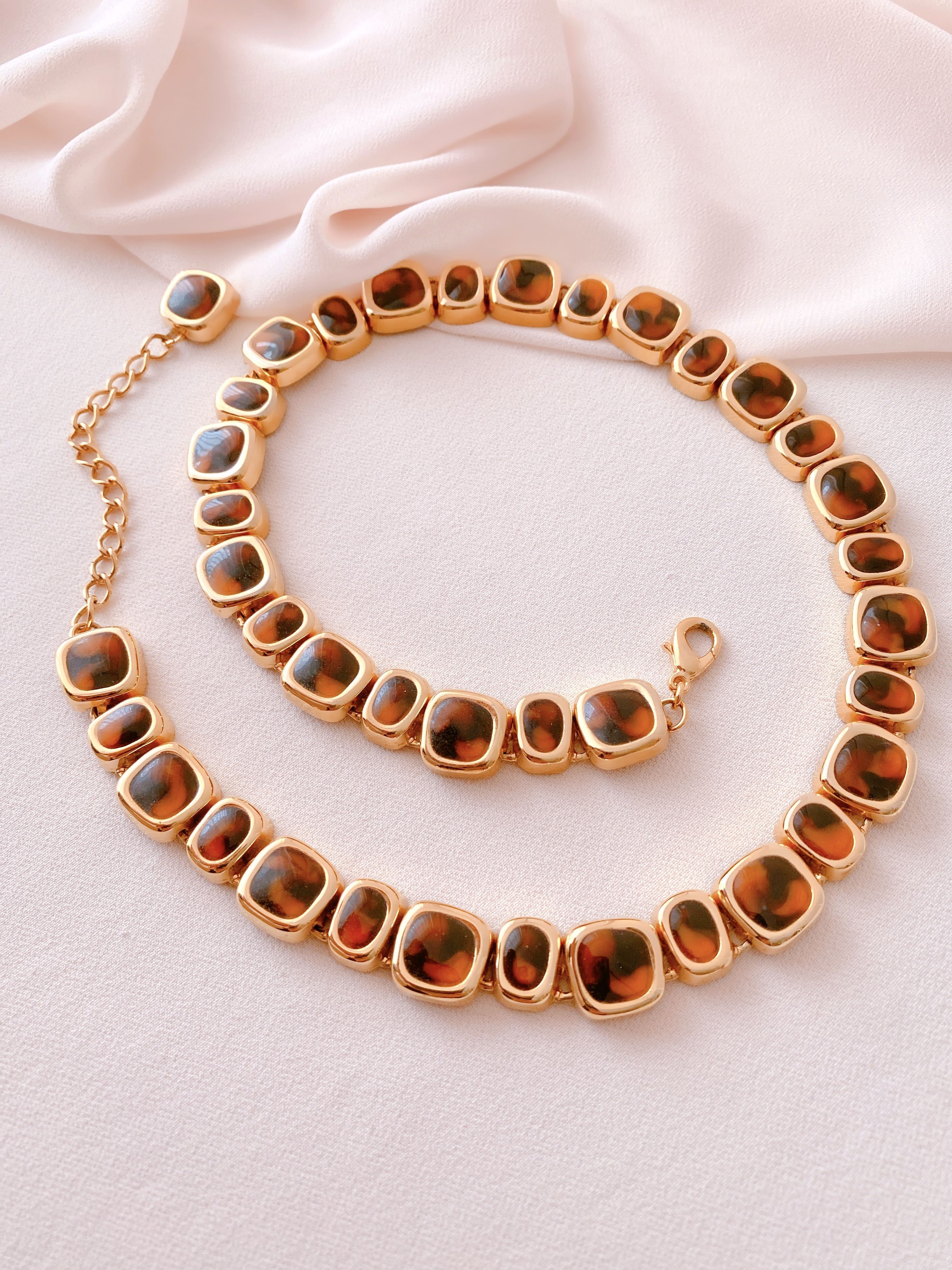 Каждое звено этого колье — как капля застывшего времени, где переплелись оттенки кофейных сумерек и карамельного рассвета. Золочёные звенья, украшенные ювелирной смолой, мерцают глубиной спелого янтаря и шёлковым блеском кофейных зёрен. Они словно хранят тихий диалог между светом и тенью, создавая танец бликов, который оживает при каждом движении. Это не просто украшение — это летопись, где каждая деталь становится словом, а весь облик — поэмой, написанной мастером.ANNE KLEIN: Алхимия совершенства