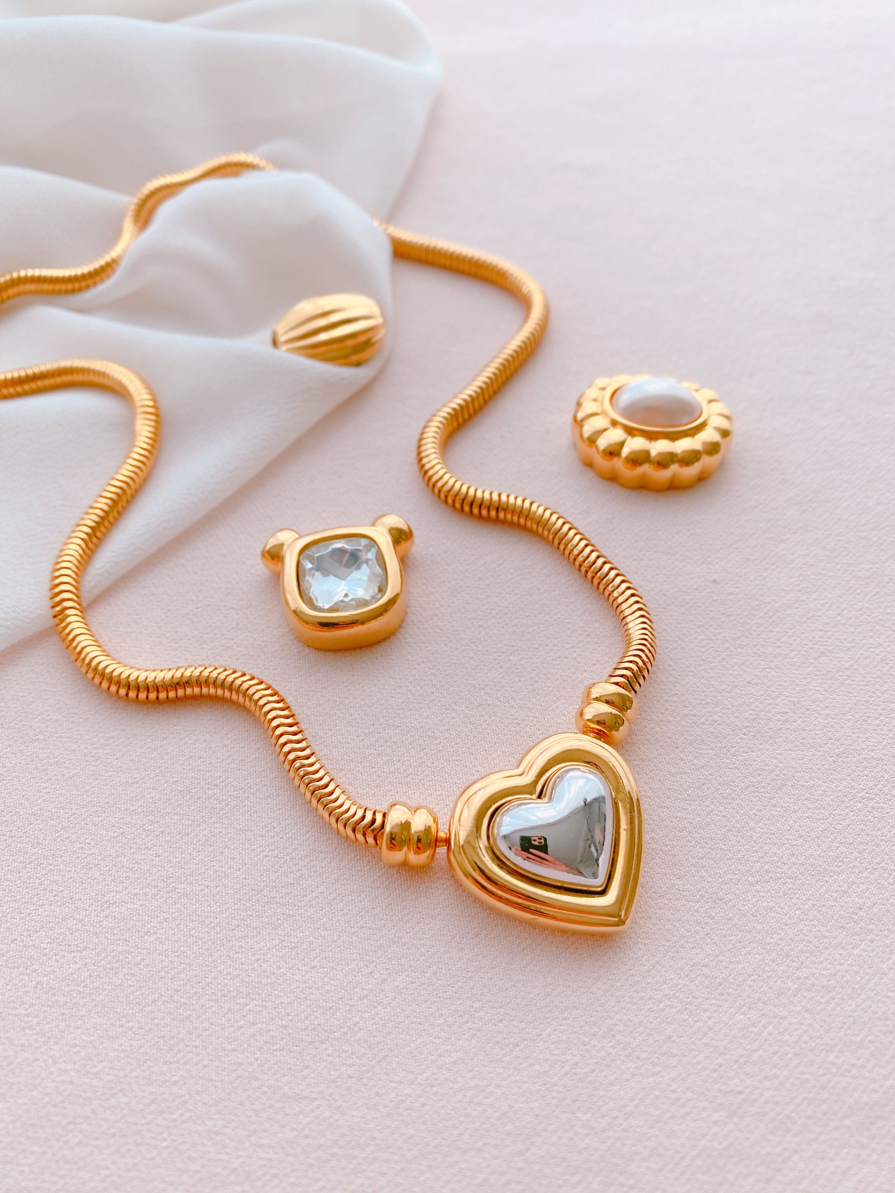 Это колье-трансформер как раз об этом! Оно быстро преображается "легким движением руки". Украшение имеет четыре сменных кулона, которые можно легко заменять в зависимости от настроения, стиля одежды и даже случая. К примеру, утром в офис Вы можете надеть колье с жемчужиной, придав образу нотку женственности, а вечером легко меняете на сердечко с романтичным настроением. Кулоны легко меняются: в каждом кулоне есть прорезиненные отверстия, надежно удерживающие штыри цепочки.