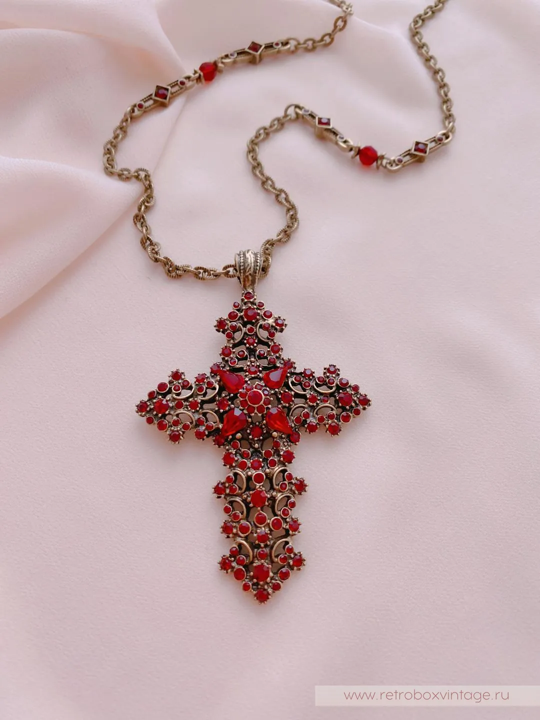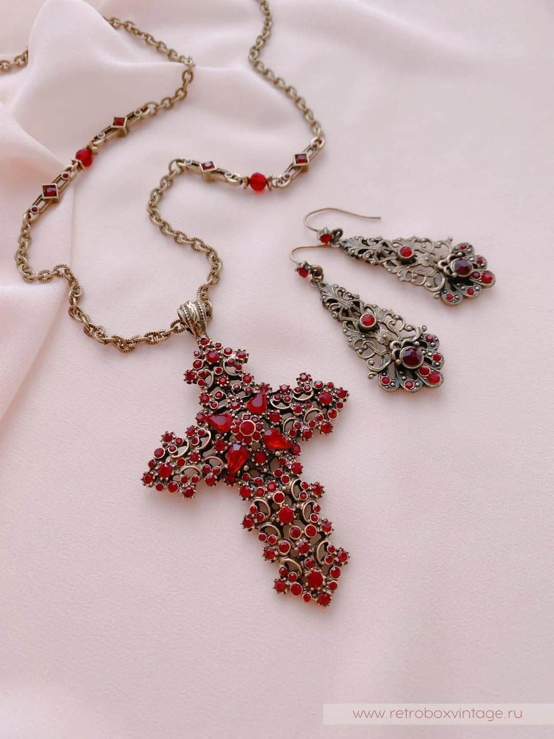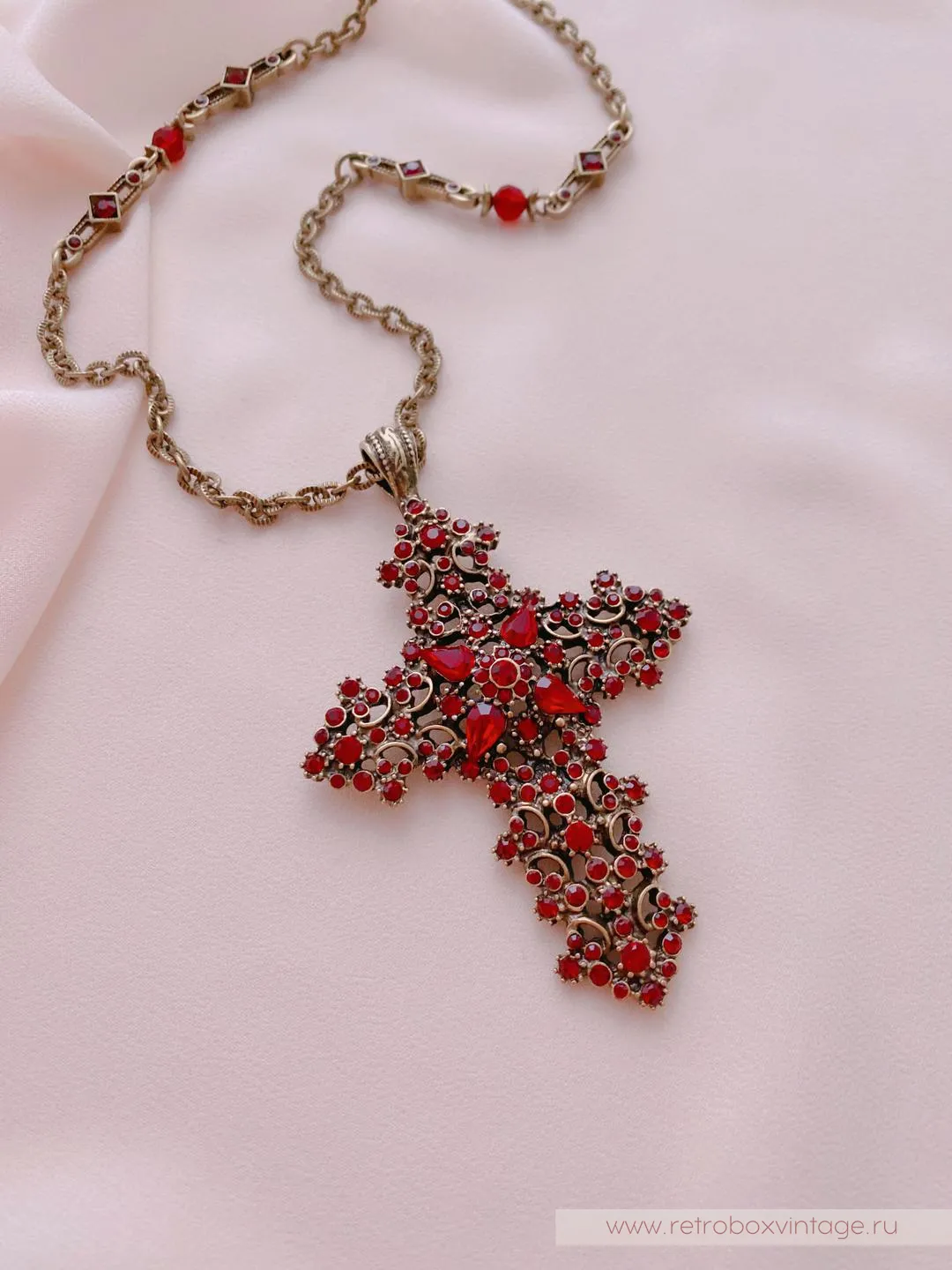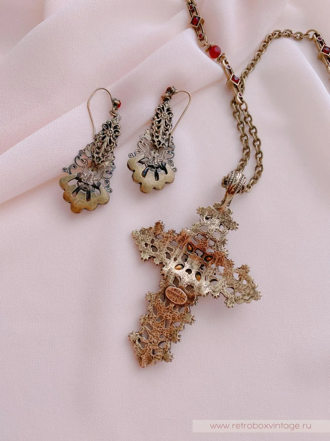 Красивый комплимент эпохе и минералу, это винтажное колье повторяет стилистику исполнения мастеров прошлого. Крест с покрытием полированной бронзой, витиеватым узором и превосходными кристаллами гранатового стекла в сочетании с тонкой ручной работой смотрится также благородно, как реликвии королей из Национального музея.Если вы, как говорила Шелли Купер, тоскуете по уникальным украшениям прошлого, то эти украшения позволят вам воплотить мечту и пополнить коллекцию изделием, достойным стать вашей семейной ценностью.