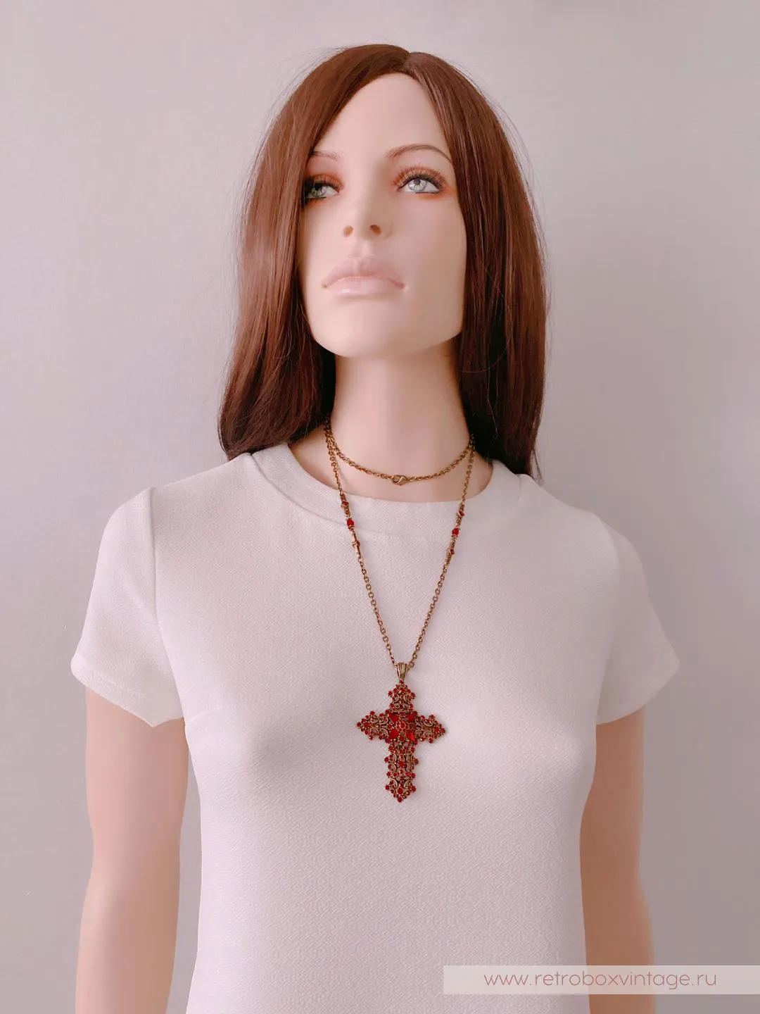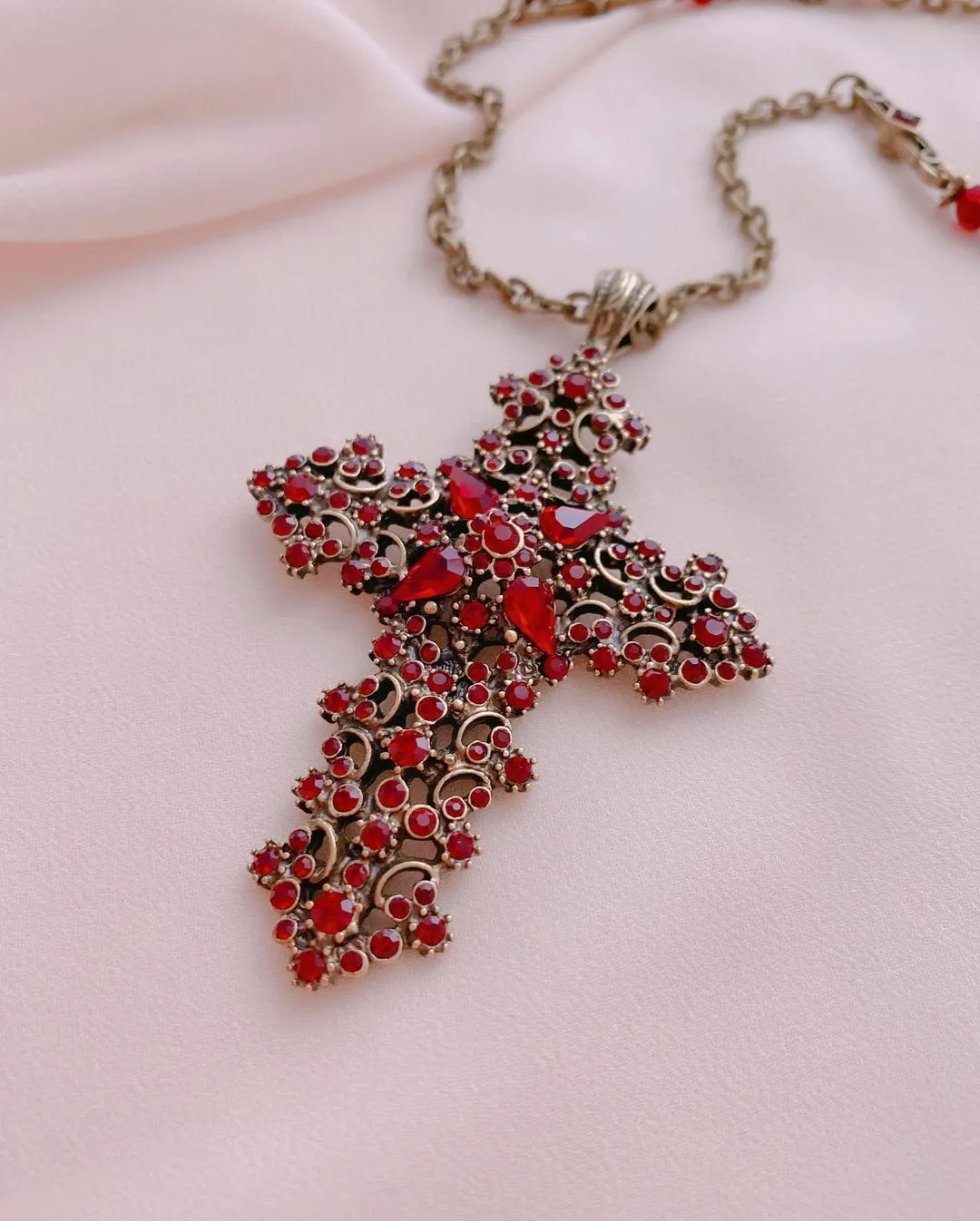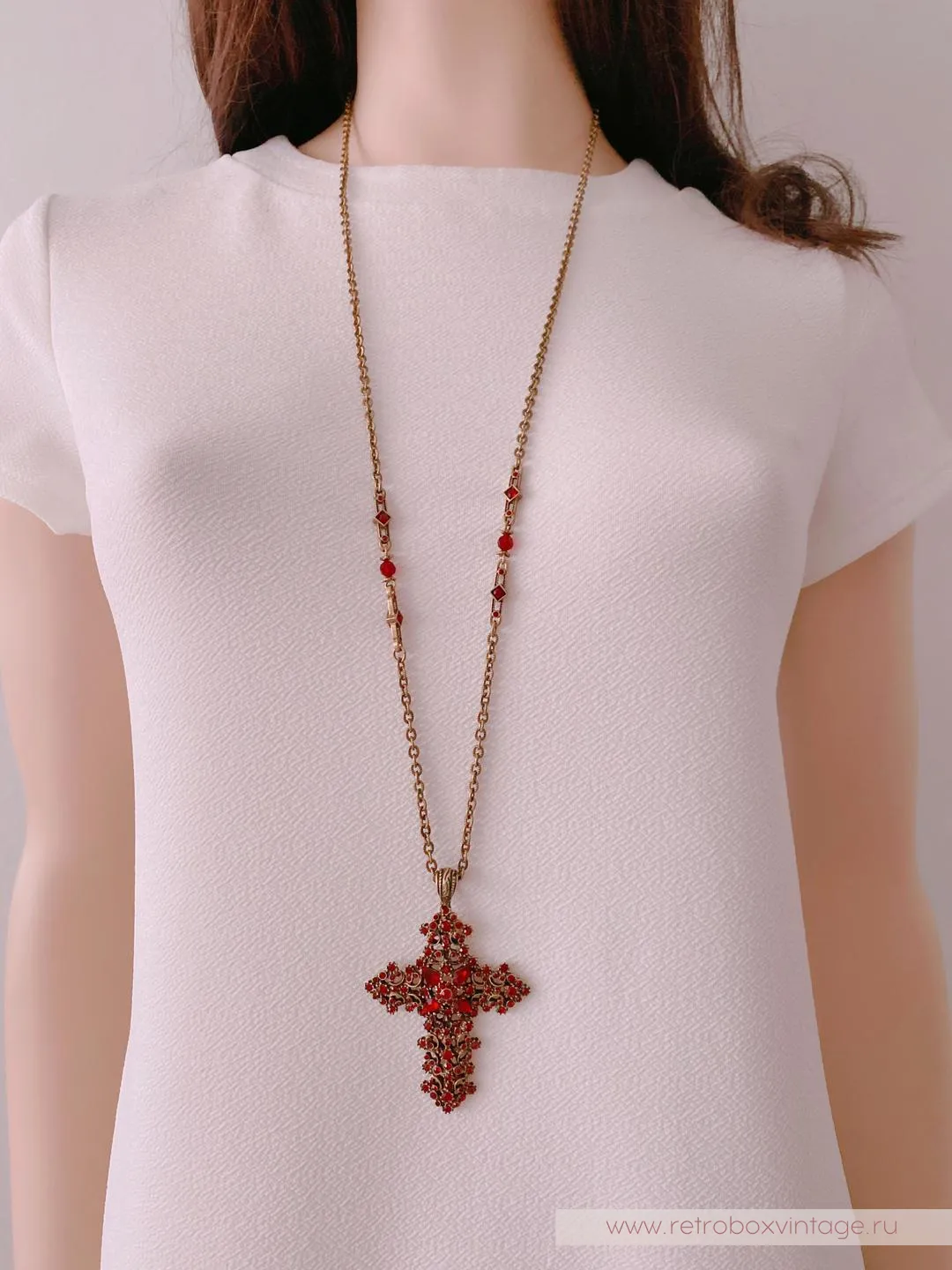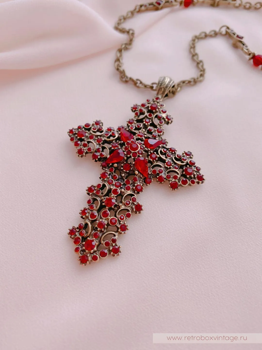 Красивый комплимент эпохе и минералу, это винтажное колье повторяет стилистику исполнения мастеров прошлого. Крест с покрытием полированной бронзой, витиеватым узором и превосходными кристаллами гранатового стекла в сочетании с тонкой ручной работой смотрится также благородно, как реликвии королей из Национального музея.Если вы, как говорила Шелли Купер, тоскуете по уникальным украшениям прошлого, то эти украшения позволят вам воплотить мечту и пополнить коллекцию изделием, достойным стать вашей семейной ценностью.