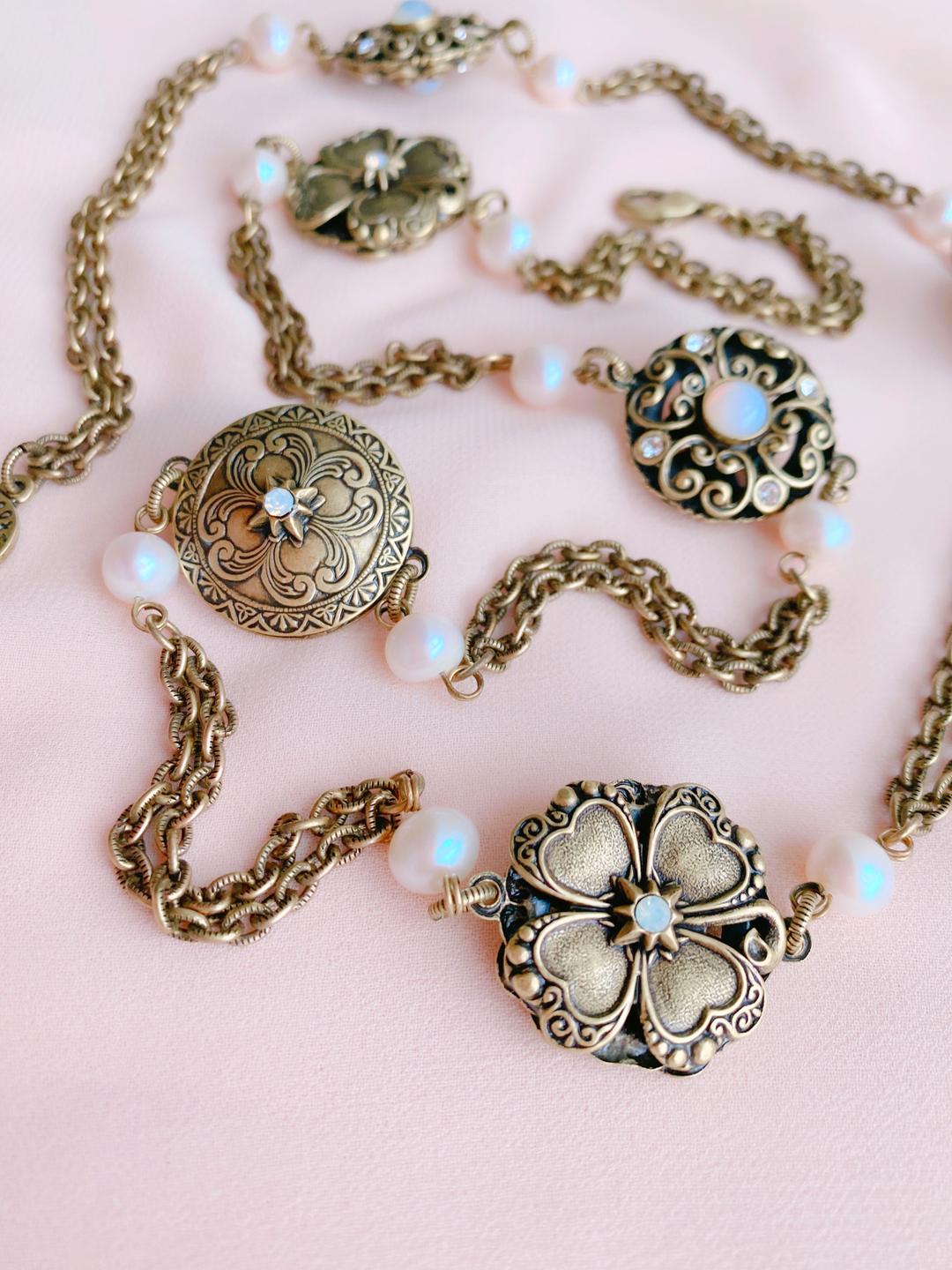 Центры клевера украшены художественным стеклом ручной работы, а замысловатые «щиты» австрийскими кристаллы высшего качества. Благородный цвет металла придаёт украшению винтажного очарования.Каждый элемент колье SWEET ROMANCE отмечен завершенностью композиции, фантазией, а отделка − тщательностью проработки.