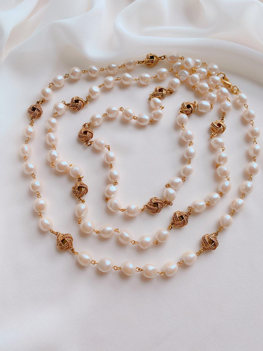 Как думаете, не эта ли традиция вдохновила JOAN RIVERS на создание сотуара, в котором так гармонично сочетаются узлы и жемчужные бусины? Одиннадцать желаний заключены в изящные золоченые сплетения, похожие на филигранные кельтские узлы. Барочные жемчужинки нежного сливочного оттенка подобны символам воды, наделяющей обладательницу науза интуицией.Узел прост и элегантен, поэтому всегда остается в моде, как и жемчужный сотуар, который обязан быть в шкатулке леди. Ведь он хорошо сочетается как с выходным, так и с повседневным образом.